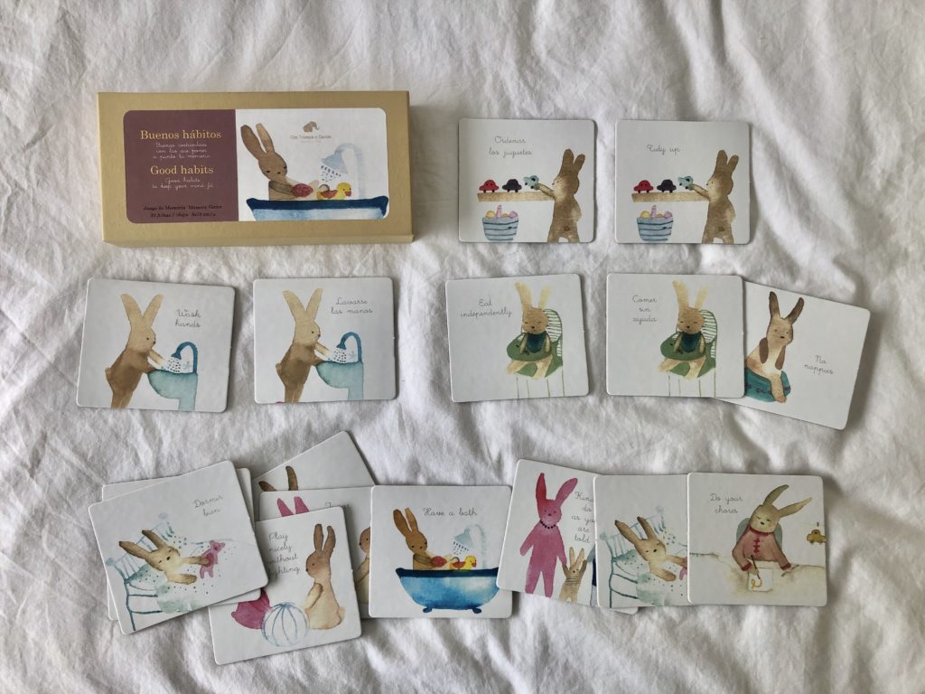 El Memory de Buenos Hábitos tiene unas ilustraciones preciosas con el que ayudar a los niños y niñas a recordar las pequeñas rutinas de cada día como lavarse los dientes, recoger los juguetes, bañarse, etc…Cada pareja tiene un dibujo y la acción escrita en letra ligada; una tarjeta en español y otra en inglés, lo que hace que puedas usarlo desde los 2-3 años con las imágenes (y en lugar de empezar el juego con las tarjetas boca abajo, todas boca arriba y la tarea consiste en encontrar la pareja) hasta los 7-8 que lean perfectamente en español y en inglés. El memory de buenos hábitos combina el juego con la educación en rutinas y hábitos de una forma divertida, puedes comprar el Memory de Buenos Hábitos AQUÍ
