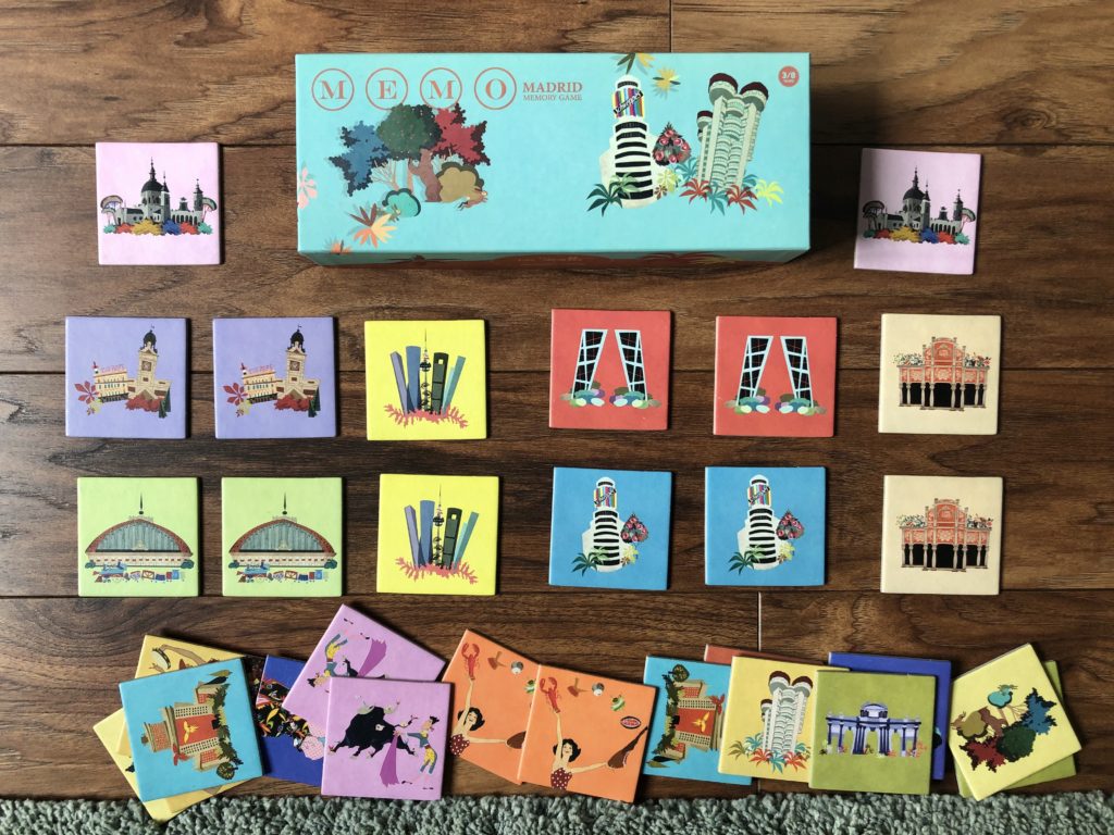 Este juego de memoria me encanta para regalar tanto a niñas y niños de Madrid y que aprendan los edificios de su ciudad como para llevar de recuerdo a niños y niñas de fuera de Madrid o de España. El crack de Abraham (Abe the Ape) creó una colección de souvenirs llena de simbolismo cañí denominda Deallí dentro de la que se encuentra este Memory de Madrid en el que puedes encontrar desde las Torres Kío hasta el Cine Doré pasando por el Palacio de Cristal o la EStación de Atocha.