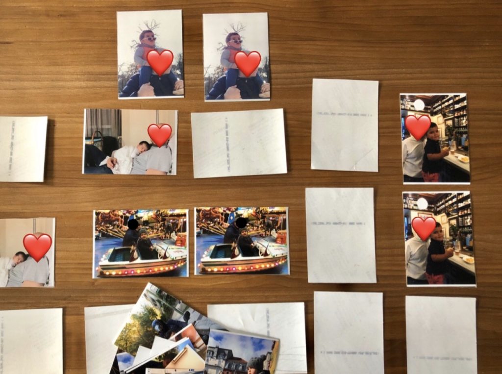 Es un memory que puedes hacer en casa; imprimiendo doblemente fotos de la madre o el padre con los hijxs, para mayor duración recomiendo que las plastifiquéis, puedes hacerlo tan grande como quieras, yo lo hice como regalo del día del padre cuando mi hijo mayor tenía dos años y medio y desde entonces es uno de sus favoritos.