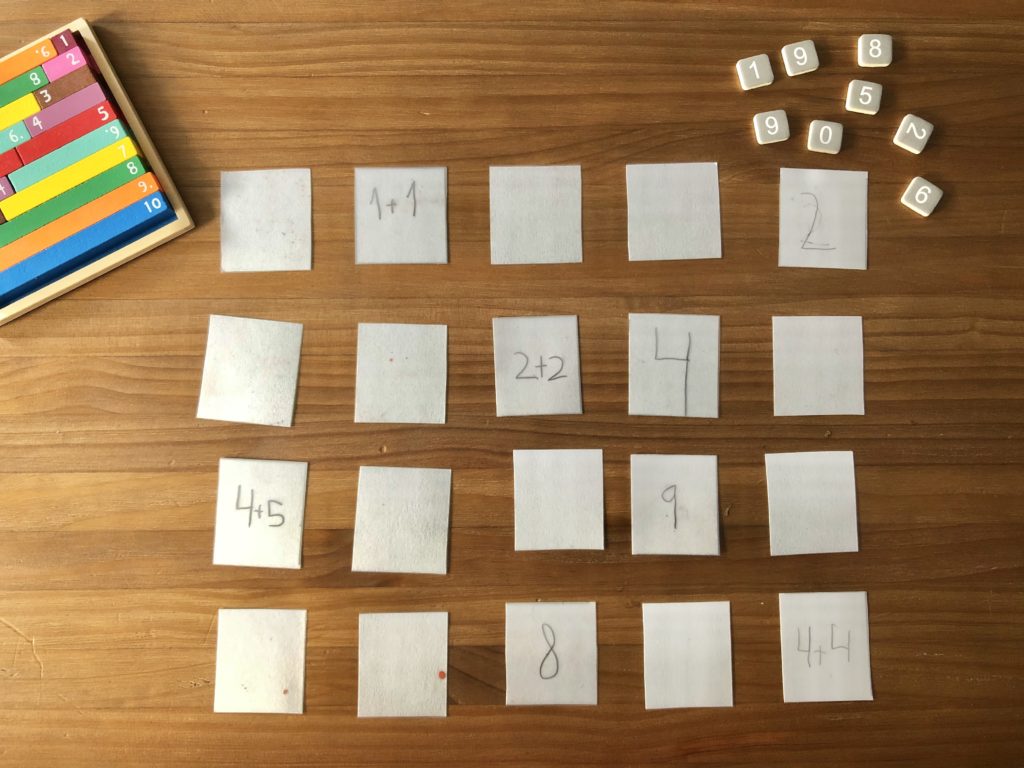 Mi hijo trajo la idea del cole y me encantó, además de que puedes complicar las operaciones según van avanzando sus conocimientos, su profe les ayudó a crearlo e hicieron 5 parejas por sumas de 1+1, 2+2, 2+3, 3+3, 3+4, 3+5, 4+4, 4+5, 5+5 con sus correspondientes parejas 1 (con el nombre del niño),2,3,4,5,6,7,8,9 y 10, una idea que podéis hacer en casa en estos días, si tenéis la opción de plastificarlo, mejor!