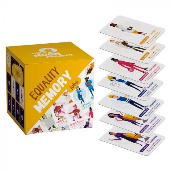 Un juego de memoria que consiste en emparejar profesiones de forma igualitaria, parejas en las que siempre una tarjeta es una chica y la otra un chico; por ejemplo dos bomberos, dos policías, etc…De esta forma ayudamos a los niños y niñas a visualizarse en todo tipo de profesiones desde pequeños evitando los estereotipos de género. Además, las profesiones vienen en varios idiomas con lo que se puede practicar el español, francés, inglés y alemán. Puedes comprarlo en Dideco
