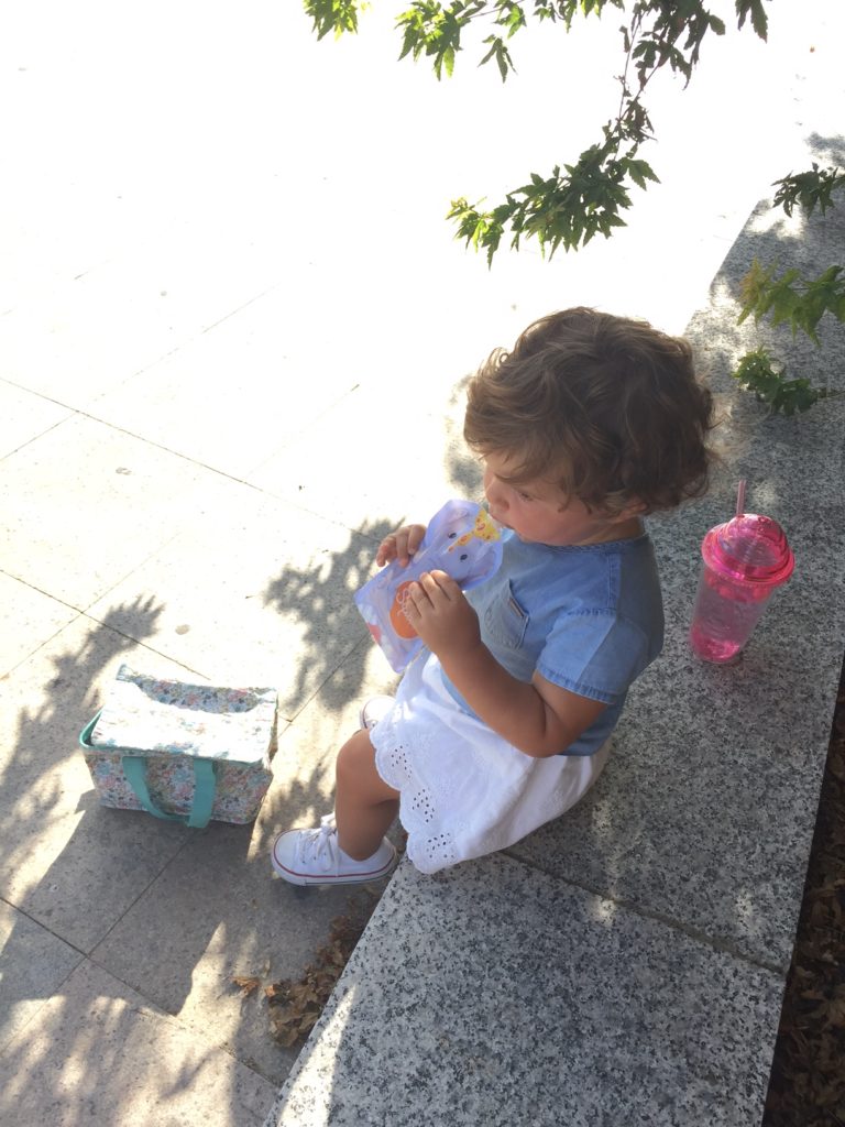 A principios de verano Frida (con 16 meses) comenzó a cansarse de la papilla de fruta, llegaba la hora de la merienda y, unos días, empezaba a tomarla pero a la cuarta cucharada se cansaba y, otros días, directamente decía que na nai. Intentamos darle sólido (que ya tomaba desde hace bastante) pero el caso es que tomando fruta sólida comía mucha menos cantidad, me parece genial que la tome entera, pero quería que ingiriera alguna pieza más al día.