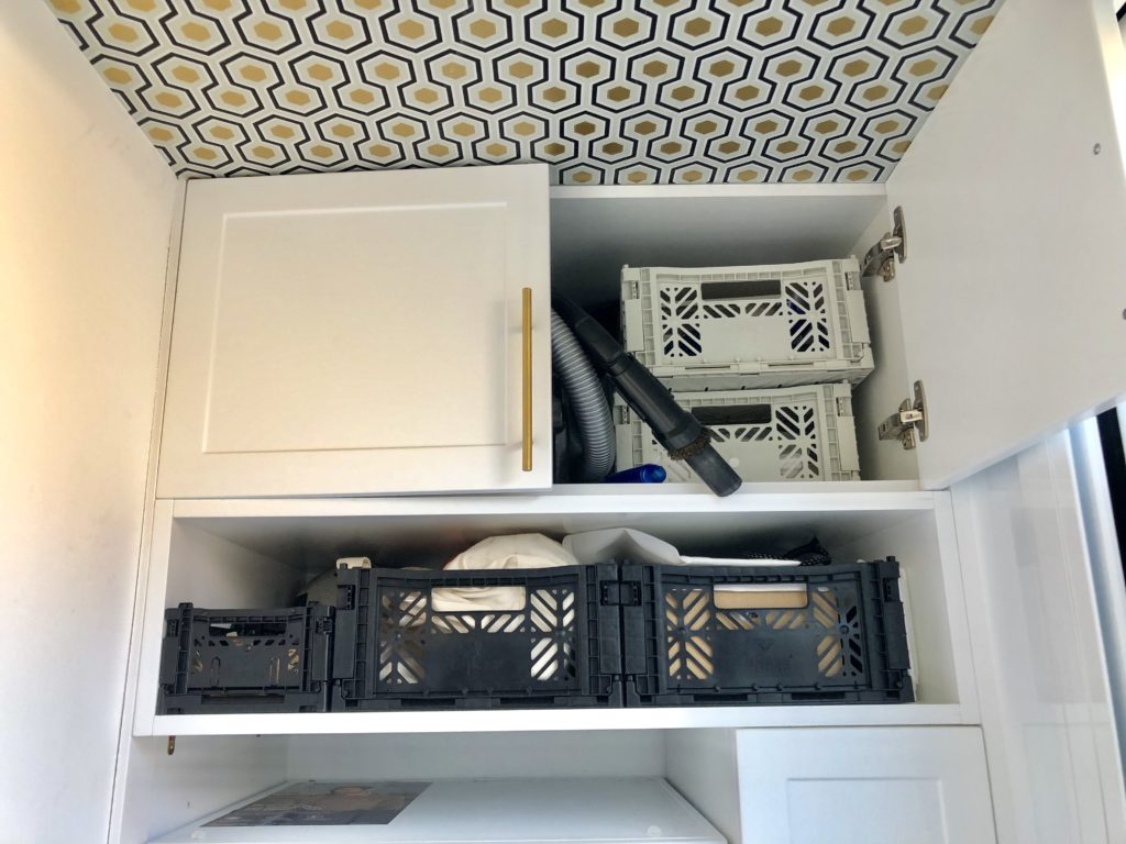 En la parte superior dejamos un hueco con puerta para la aspiradora y también con la altura suficiente para dos cajas de almacenaje plegables que, además, son apilables. Ahí guardo también el lápiz quitamanchas que utilizo para quitar manchas importantes antes de meter la ropa en la lavadora…Que, por cierto, ¡Estoy sorteando uno en Instagram hasta mañana! y AQUÍ podéis ver mejor cómo usarlo.
