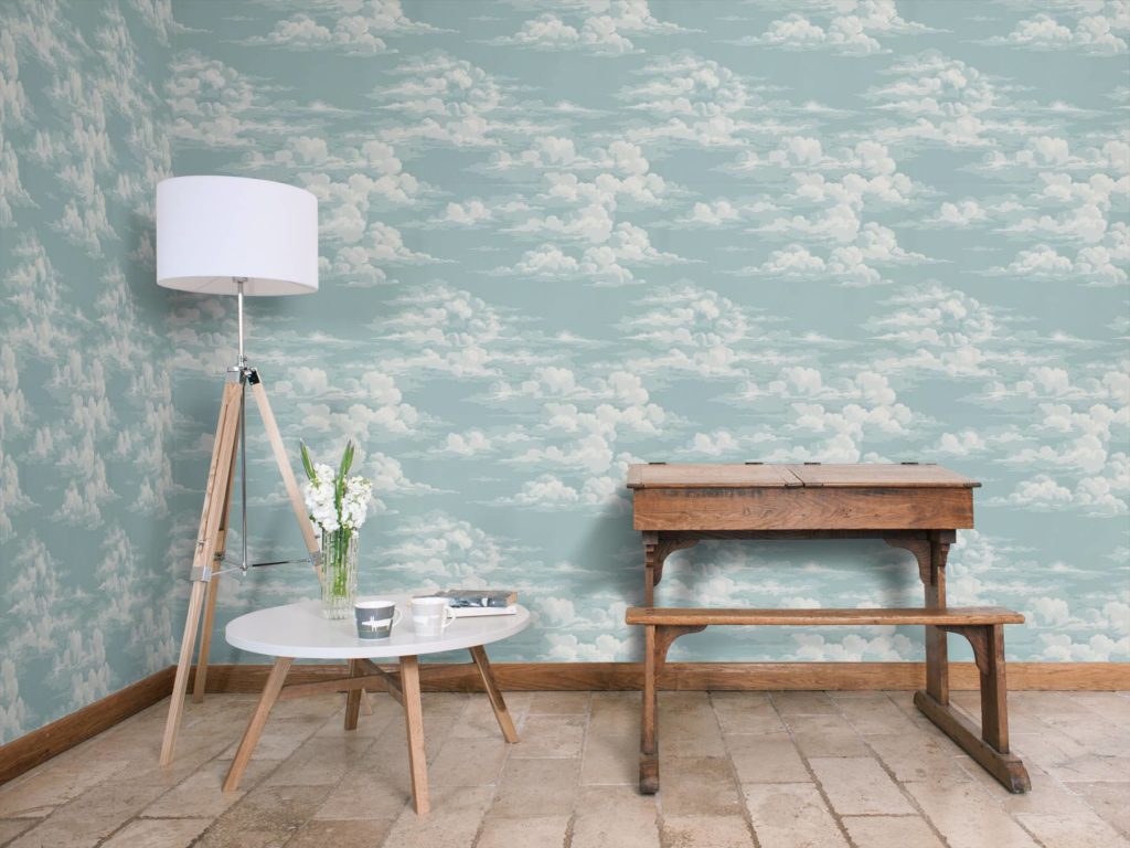 La idea del papel pintado en el techo se me ocurrió cuando, mirando papeles, me gustaban tantos que me faltaban estancias para ponerlos, tuve un flechazo con un papel pintado de nubes de Sanderson y me lo imaginé en el techo del tendedero, pero resulta que estaba pintado para ser colocado en vertical, no en horizontal y no me cuadraba.