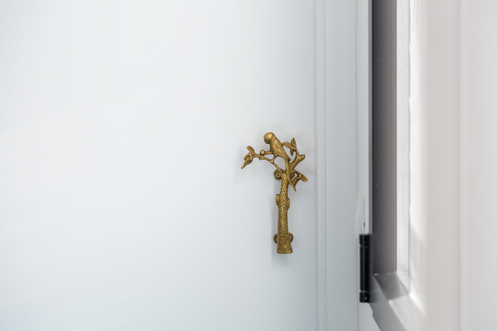 El último toque de la zona de lavado y secado es el tirador de la puerta. Un tirador que me encantó al verlo y que cuando lo compré no sabía para dónde sería, pero sólo quedaba un par en la tienda y sabía que acabaría colocándolo en algún sitio, me encanta porque desde la cocina, una puerta blanca de madera con el tirador pájaro, no da la sensación de que ahí esté la terraza. Ahora lo puedes encontrar en la tienda Aunty B y hay muchos más modelos.