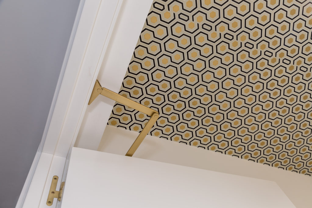Con la idea ya en la cabeza de poner papel pintado en el techo pasé a la lista de papeles que me gustaban pero que no tenía espacio para colocar, y en ella estaba éste de octógonos en dorado y negro de Cole & Son, a partir de ahí me imaginé una zona de lavado en blanco, negro y dorado. Es una zona de lavado pequeña y estrechita, pero queríamos darle el toque.