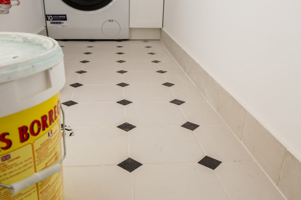 Otro de los elementos importantes al pensar la estancia, fue el suelo, no quería el típico blanco, el suelo damero me apetecía mucho pero al ser una estancia pequeña optamos por este modelo damero en pequeño, en un gris claro (menos sucio qu el blanco) con cuadraditos negros, en combinación con el papel pintado del techo, que encontré en la tienda online de azulejos Naïs, donde te envían muestras de los azulejos que necesitas para que te hagas una idea de tamaño, color, textura…Os la recomiendo mucho por el ahorro de tiempo que supone y por lo poco que tardan en enviarte todo, la experiencia de compra fue fantástica la verdad.