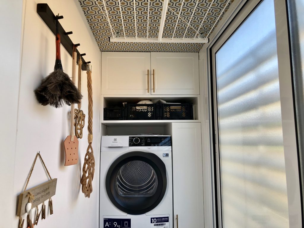 Contaba con la lavadora y la secadora de Electrolux y, a partir de ellas, diseñamos un armario a medida para la tabla de la plancha, la aspiradora, escoba y demás cosas de limpieza. Si vas a diseñar un armario (de cualquier tipo) te recomiendo que pienses lo que vas a meter y si puedes concretar en las cajas que utilizarás (por ejemplo yo iba a poner nuestras cajas de almacenaje plegables), las medidas y en función de eso decidas la altura de los estantes.