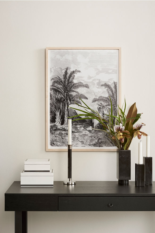 Me ha resultado muy gracioso encontrarme en HM Home un póster con un estampado similar, un póster de palmeras en la selva en blanco y negro, es decir, la versión mini de la tendencia.