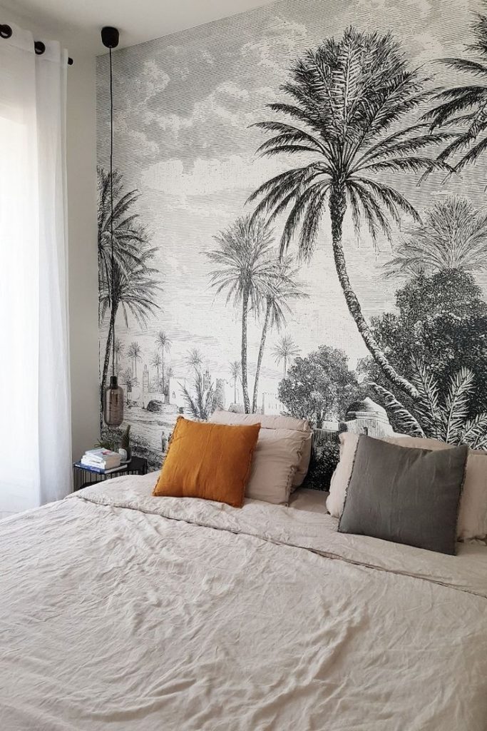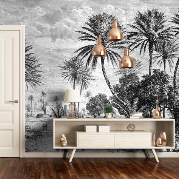 Más cerca, tenemos un papel de pared de selva en blanco y negro similar en Maison du Monde a un precio imbatible (149€ el mural de 3 metros x 3.50m de alto)