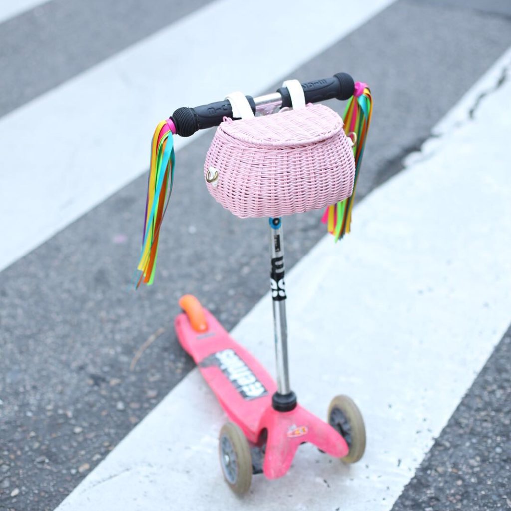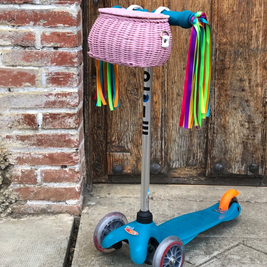 Los flecos para el patinete los puedes encontrar en multicolor (arco iris) o en mint, turquesa y naranja y la cesta de mimbre para bici de niños en natural, rosa o amarillo.